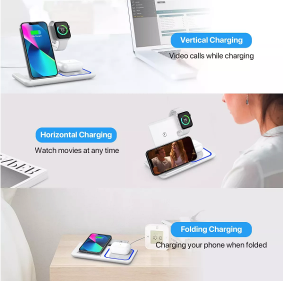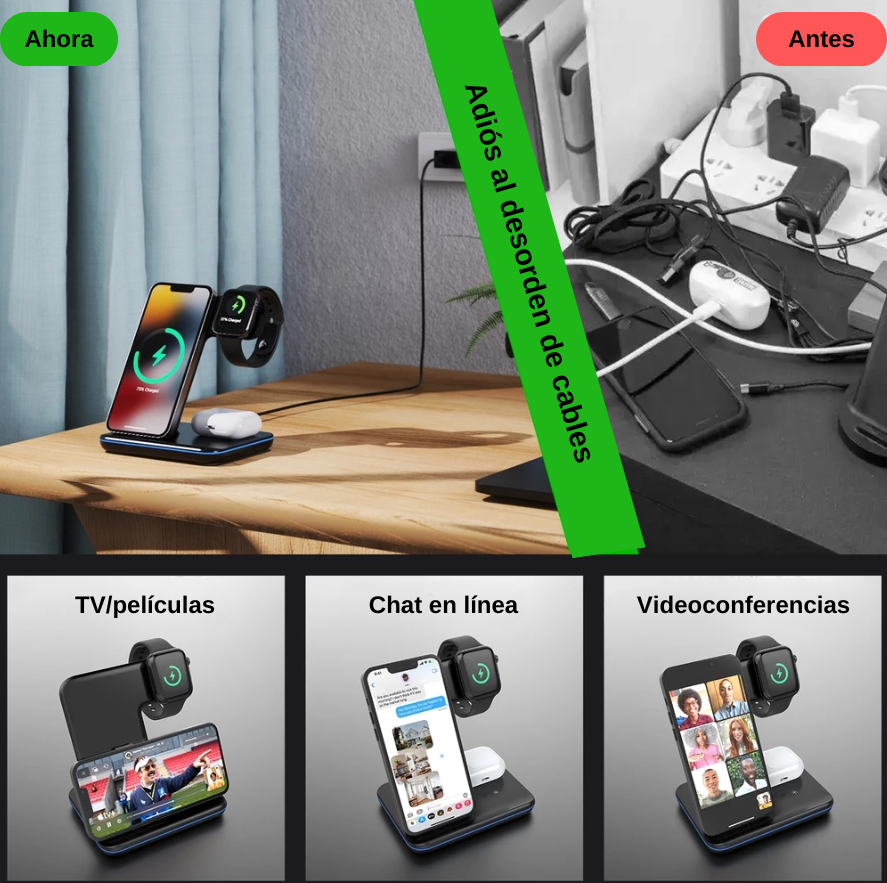 Me encanta que puedo cargar mi celular, reloj y audífonos al mismo tiempo sin enredos de cables. Además, lo uso como soporte para ver videos. ¡Muy recomendado!
