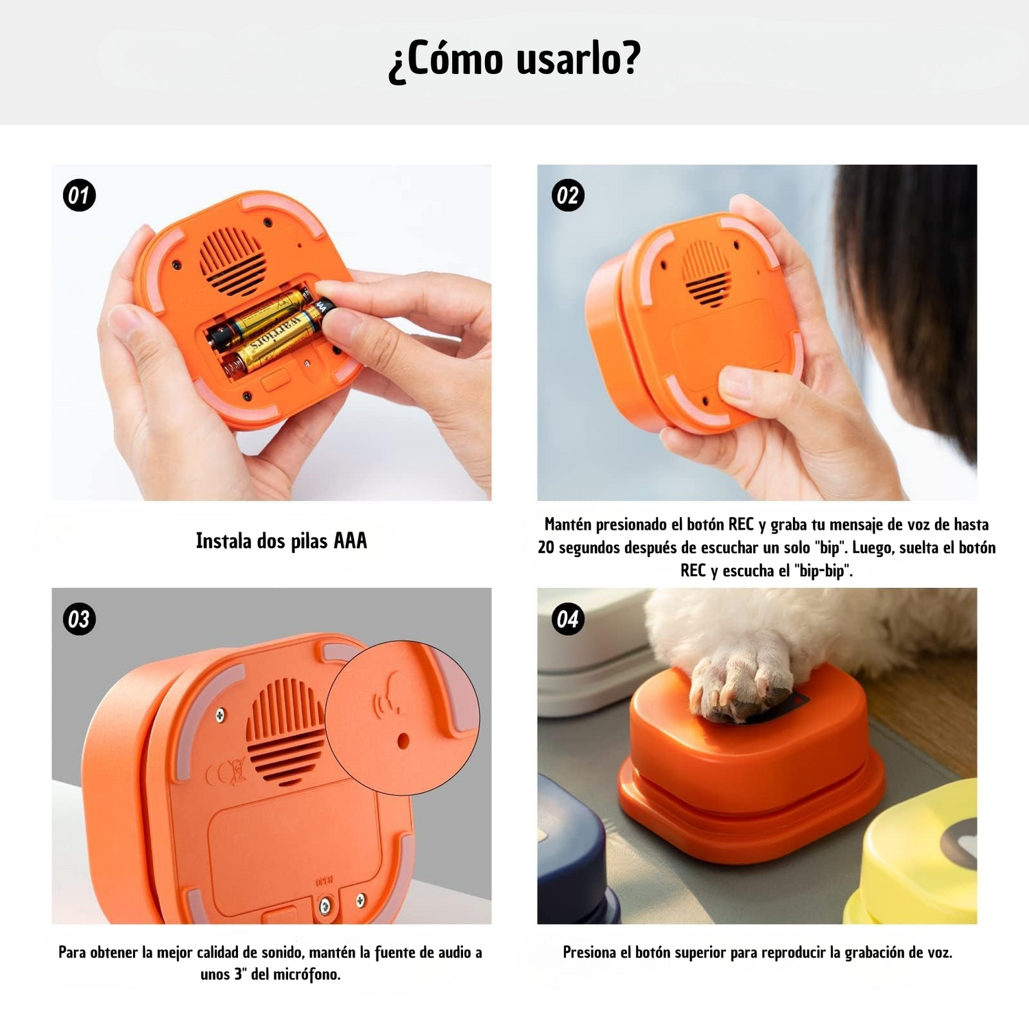 Mi perrita Luna usa el botón para pedir agua. Es divertido ver cómo aprende, y la calidad del sonido es excelente.
