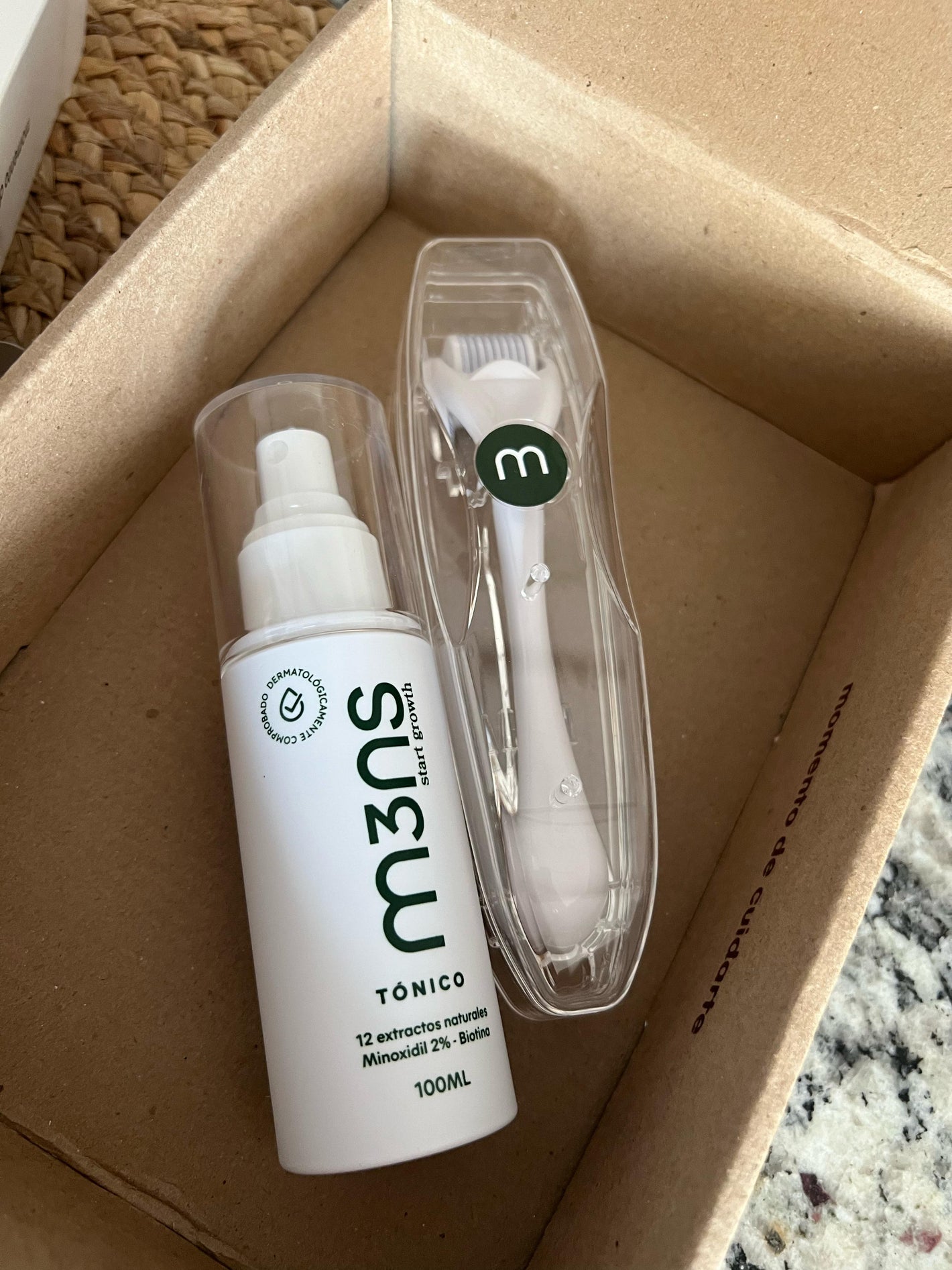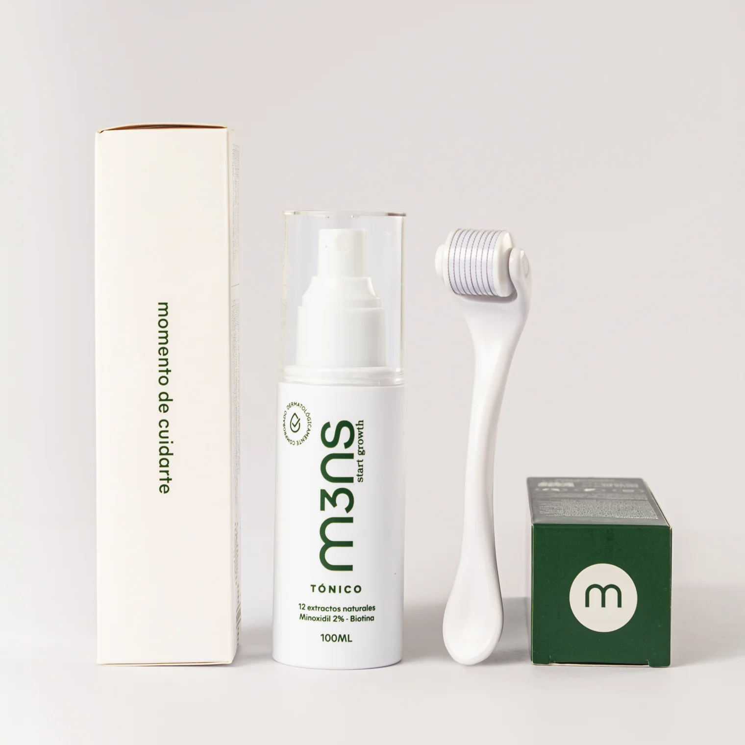 Este completo kit incluye un tónico que combina Minoxidil 2%, biotina y 12 extractos naturales como romero y menta, conocidos por sus propiedades revitalizantes. Inlcuye también un Derma Roller para potenciar tu rutina de cuidado capilar. Al usarlos juntos, estimulas el flujo sanguíneo, activas los folículos pilosos y maximizas la absorción de nutrientes del tónico, fomentando la producción de colágeno y la regeneración celular.